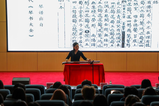 张琳向同学们详细讲解了古琴的发展历程、构造以及古琴在历代文人生活中的重要性、在中国传统文化中的重要地位等。在讲解古琴谱(减字谱)知识过程中,张琳也不时以现场弹奏的方式进行举例讲解,带领师生们一同走进古琴指法的世界,并通过小游戏加深同学们对于琴谱的记忆。