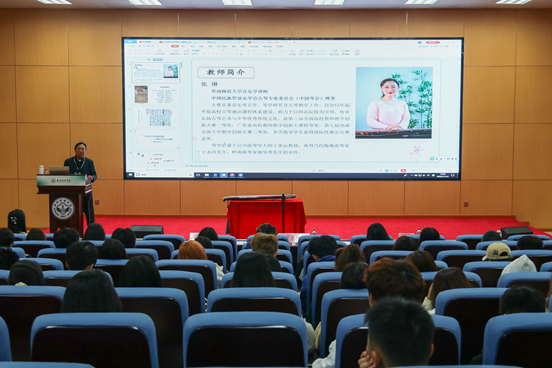 音乐系直属党支部书记郝大微致欢迎辞。他对张琳老师的到来表示热烈的欢迎,并希望能通过此次讲座,让大家了解古琴历史,领略琴器之美,传承发扬中华优秀传统文化,增强民族自信心。