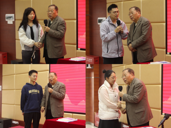 在互动环节,同学们踊跃发言,结合学习与生活中的实际,提出如何更好地弘扬雷锋精神、用雷锋精神激励与提升自己等问题。田永清一一解答。
