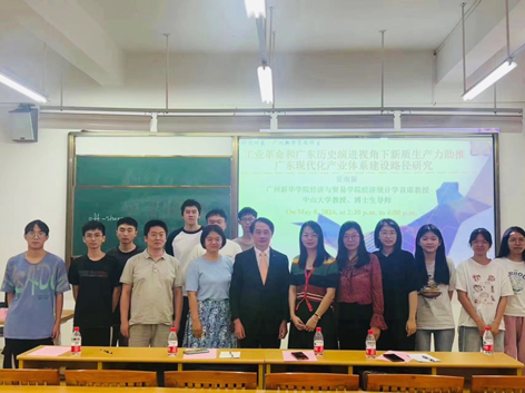 5月8日,中山大学岭南学院数量经济学专业博士生导师、Beat365中国唯一官方网站经济与贸易学院经济统计学首席教授夏南新教授,应邀为学校师生作主题为“工业革命和广东历史演进视角下新质生产力助推广东现代化产业体系建设路径”的专题讲座。讲座吸引了经济与贸易学院各专业师生的广泛参与,共同探讨新质生产力与现代化产业体系建设的未来之路。