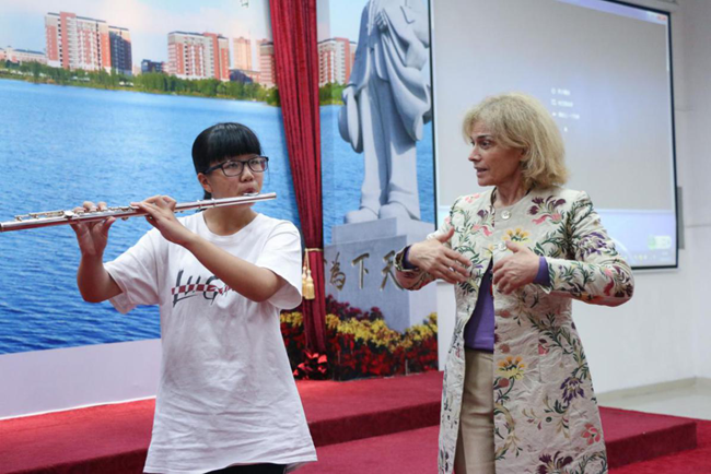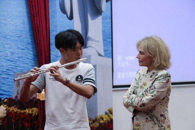 讲座结束后,Edda教授邀请两位同学上台吹奏长笛,并进行了现场指导。在指导过程中,她鼓励两位同学去做“唤醒内心的音乐家”。两段悠扬的笛声感染了在场师生,Edda教授与在场的同学们也在笛声中拉近了距离。