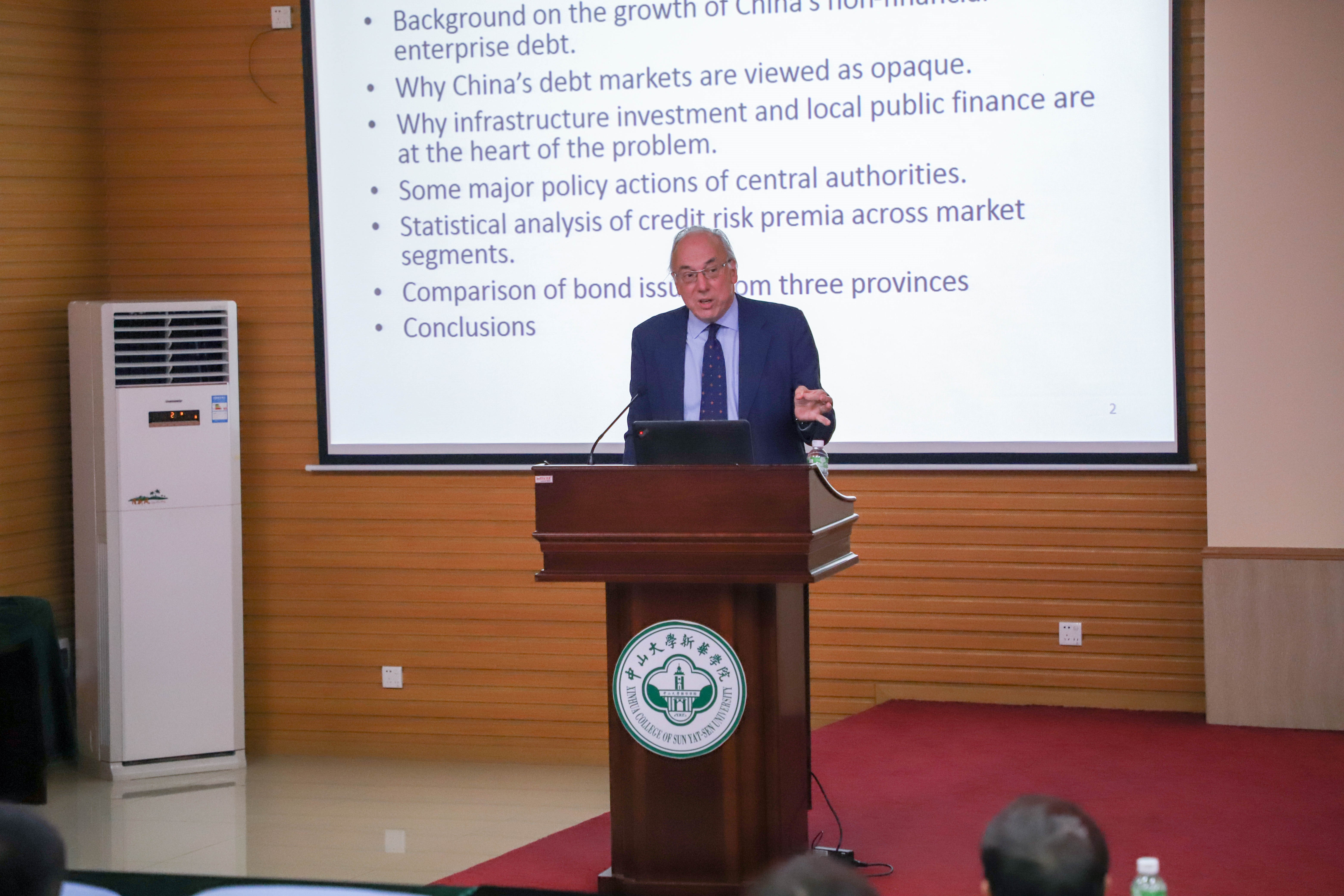 Ron Anderson教授主要从我国非金融企业债务增长的背景、外国投资者认为中国的债券市场不透明、中国信用风险的核心在于对基础设施投资和地方公共财政的解读、中央政府的一些重大政策对债券市场的影响、中国债券细分市场信用风险溢价的统计分析以及对中国三省的债券发行情况比较等六个方面阐释中国资本市场信用风险的演变过程。