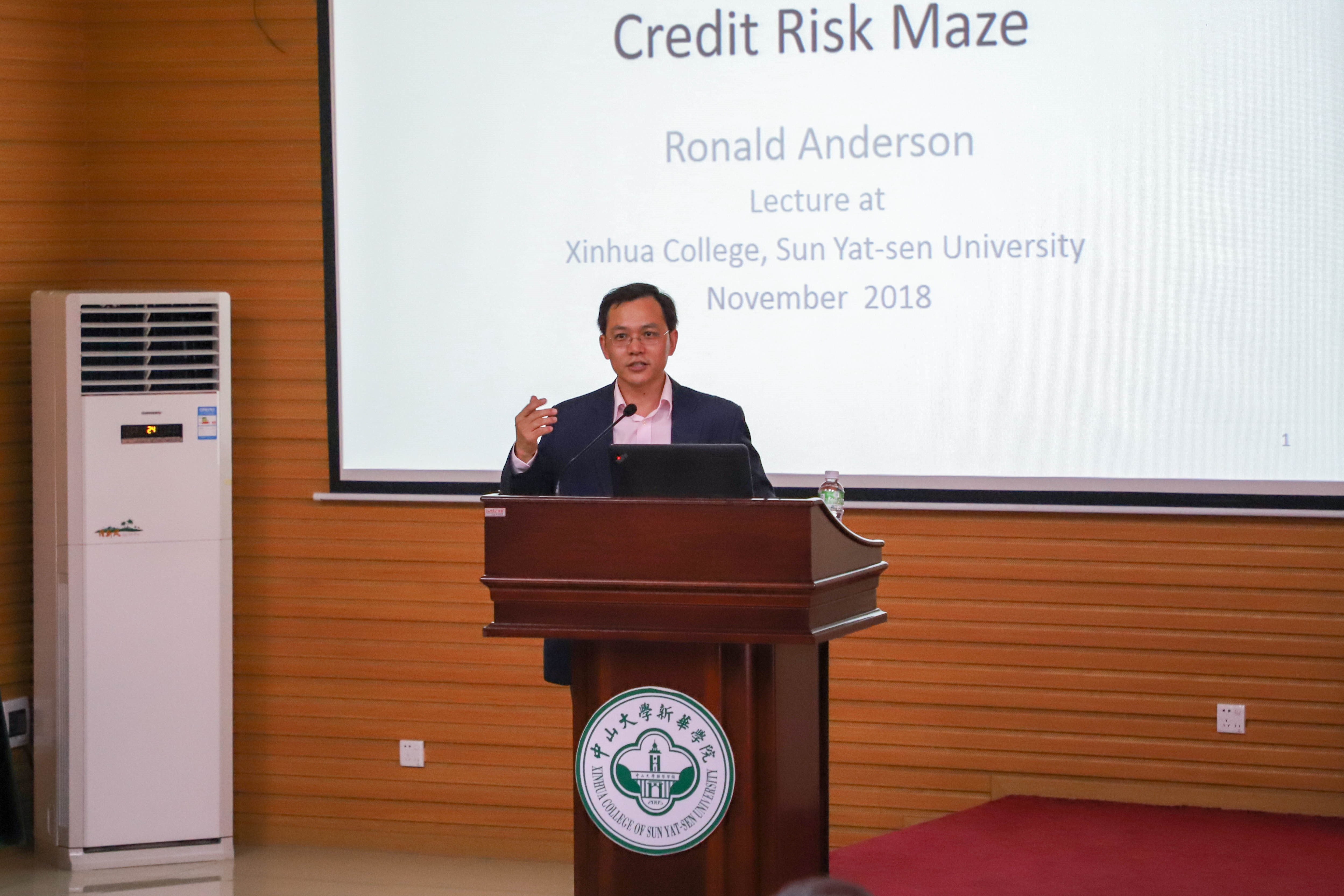 11月7日下午,世界著名经济学家、伦敦政治经济学院金融学教授、中山大学新华学院(以下简称“Beat365”)经济与贸易学院金融工程专业首席教授、投资学专业学科带头人Ron Anderson教授再次来到Beat365讲学,他带来了一场题为"Understanding China’s Evolving Credit Risk Maze"(剖析中国资本市场信用风险的演变路径)的学术讲座。本场讲座由经济与贸易学院副院长周开国教授主持、王艾嘉老师翻译。