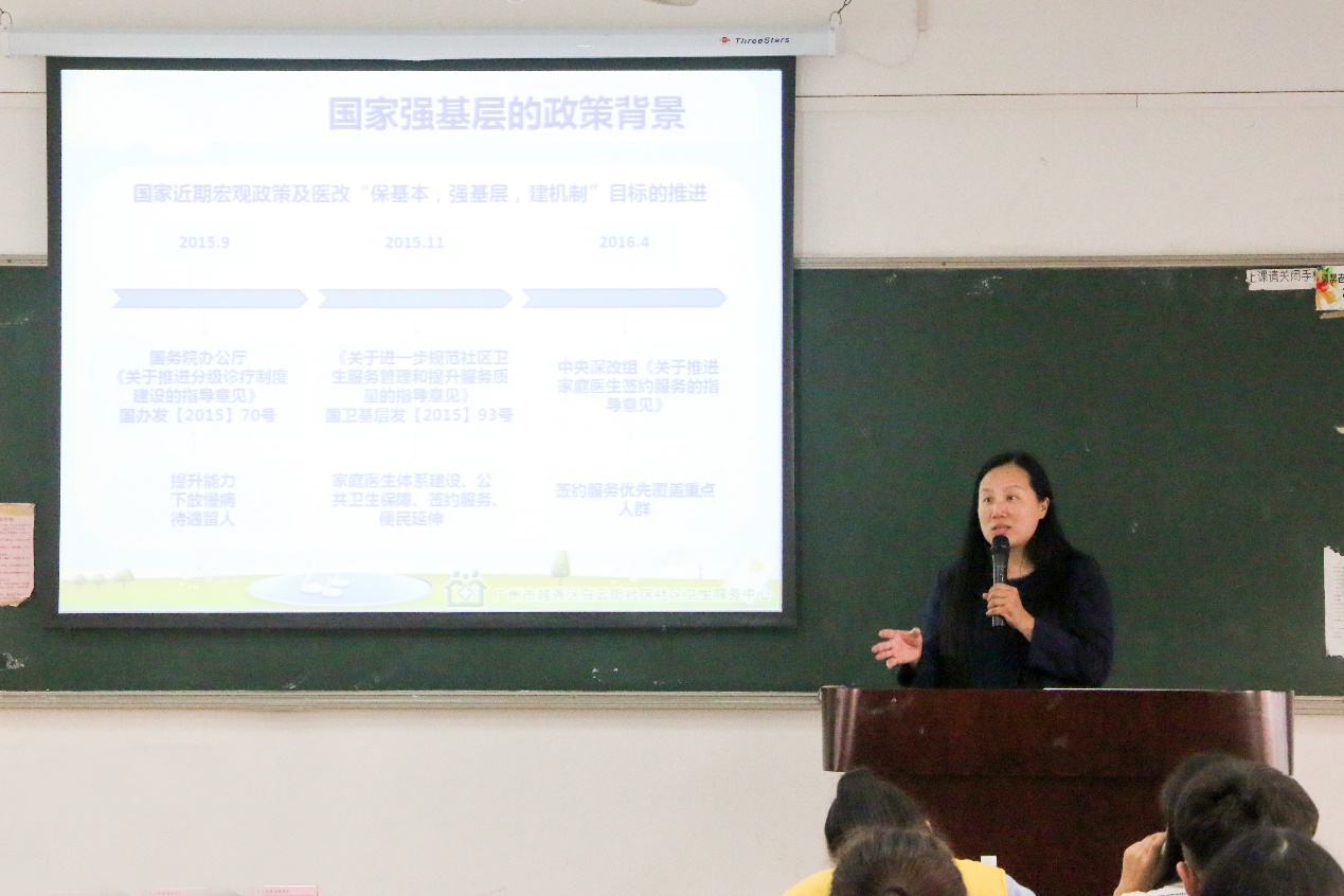 陈健英主任介绍了在目前国家政策积极推进的大背景下健康管理学科的重要性与发展前景,提出了“踏实工作,仰望星空”的市场格局,她希望在座的同学们在广东省“保基本,建基层,建机制”目标的推进与细化过程中,紧跟时代的脉搏。健康管理者作为家庭医生的合伙人,要完善分析诊疗建设,将“制度性提高、服务内涵提升、服务能力增强”作为今后发展的重点,同时推进“广州市家庭医生服务收付费标准”落到实处,促进其更好更快发展,努力向达成全方位全周期的健康服务迈进。