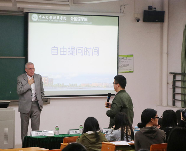 12月4日下午,由中山大学新华学院(以下简称学校)主办,学科与科技管理处和外国语学院(以下简称外院)承办的新华学者讲座在东莞校区举行。此次讲座诚邀香港大学教授Adam Jaworski担任主讲嘉宾,讲座主题为Tourist-Host of Interactions: Commodification of Language, Conviviality and Performance,外院副院长黄继炎主持讲座。外院英语专业副主任李贻、办公室主任欧衍伽,基础教研室主任袁侥蔚以及外院学子共同参加此次讲座。
