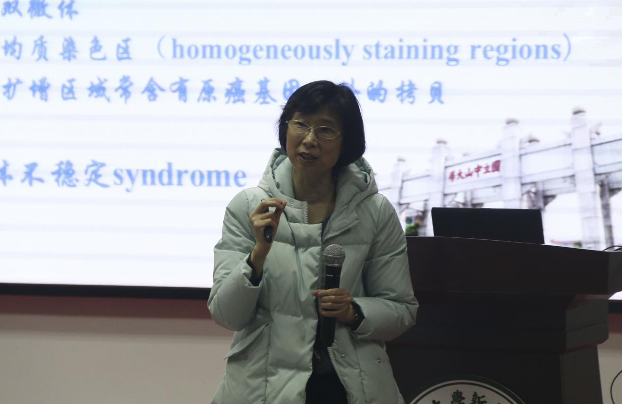 王教授紧接着从非整倍体和异倍体、基因扩增和染色体不稳定三方面去讲述癌症中的细胞遗传学改变原理,系统地讲解了肿瘤发生的机理及遗传学表现,并以乳腺癌这一高发肿瘤为例对肿瘤发生的多阶段展开了较为详细的介绍和探讨。通过王教授深入浅出的讲解,在场师生对肿瘤遗传学的相关知识理解得更加透彻,也深刻认识到肿瘤的潜移性及致命性,防治肿瘤是一场持久战,坚持良好的生活习惯,摆脱不健康行为,才能远离患上肿瘤的风险。