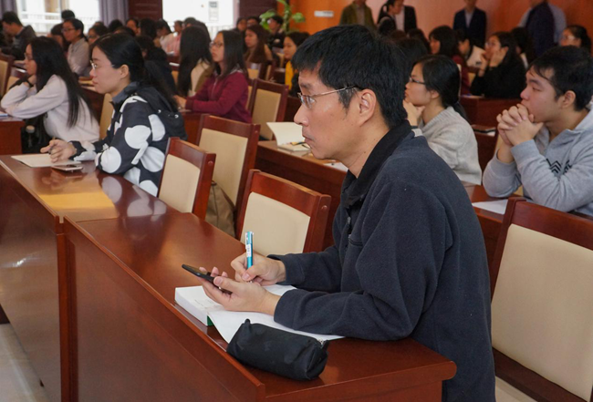 王庭槐校长为讲座致辞。王庭槐首先浅谈了何为科学?我们该如何去想?它的解决方法又是什么?王庭槐说:“学术是一辈子的事,它无关乎年龄,只要坚持做好研究,在研究中不断得到启发。作为一名研究者,就要做到老,学到老,热爱并坚守下去。”