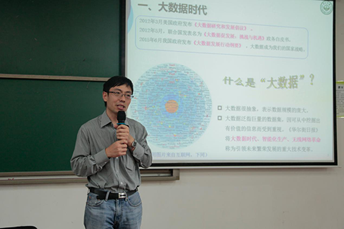 对大数据进行初步讲解后,吴维刚教授开始分析大数据的作用,他引用了2012年与2016年的图像数据,直观地向同学们展示了这四年间我国大数据信息技术的飞快发展。吴教授说:“大数据的快速发展对金融、互联网、电信、政府工作、医疗、教育等多个行业都提供了更方便、更精准的统计办法,大幅度地提高了工作者的工作效率。”他提到,与大数据息息相关的两大内容,一是物联网,二是云计算。物联网相当于是大数据的支撑点和根源,物联网是新一代信息技术的重要组成部分,也是“信息化”时代的重要发展阶段。物联网有全面感知、可靠传送与智能处理三大特征,而这些特征都与大数据密不可分。云计算则是支撑大数据的数据分析与处理的主要工具,吴维刚教授向我们展示了一条公式:云计算=数据*(软件+平台+基础设施)*服务,并对公式作详细解释,让同学们更好地理解云计算的定义。