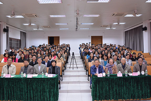 王庭槐校长对讲座进行了总结,他对郑庆璋教授一家三口、两代物理学家为中山大学新华学院作出的贡献表示感谢。他们在报告中从微观讲到宏观、从医学形态学、生理学讲到浩瀚的宇宙,大跨度的科学前沿报告开拓了在场每一位师生的眼界,王校长并向老一辈科学家“生命不息,学习不止”的科学精神致以崇高的敬意。