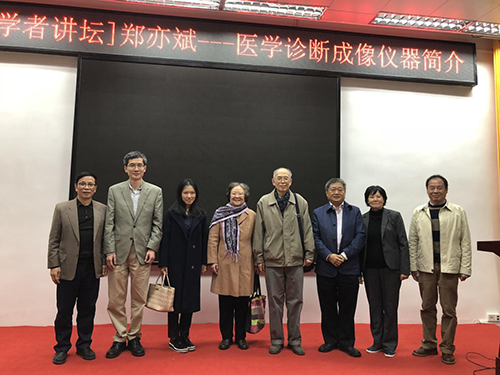 郑亦斌教授针对全球医学影像诊断技术的迅速发展,对当今先进的医学影像设备新技术进行了分析和阐述,从X-ray Radiography(X光成像)、CT(计算机断层扫描成像)、MRI(磁共振成像)、PET(正电子成像)、NM(核医学成像)、US(超声成像)等各种医学成像设备的技术特点和最新的Silent MR、PET/MR影像设备的关键技术逐一作了讲解。郑亦斌还介绍了他目前开展的集人工智能、大数据、远程诊断为一体的医疗设备研发工作,为全场师生拓宽了专业视野。