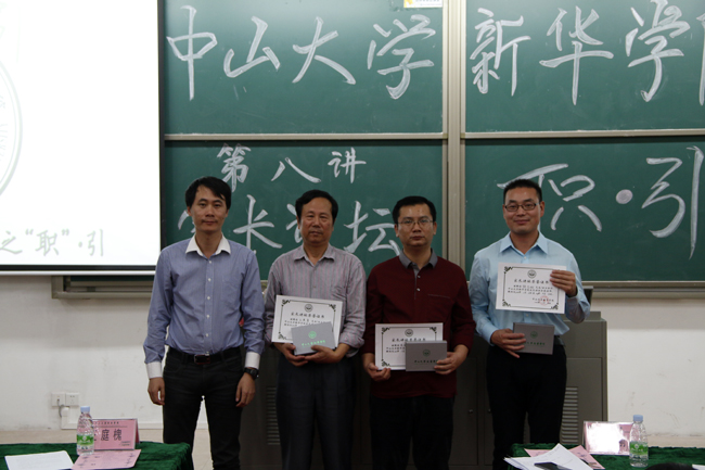 “我要走到别人的前头,我要在35岁前写出达到国家一级刊物的作品。” 、“进入职场的弊病是照搬他人的旧模式,唯有创新才是硬道理。”、“天变,人变,行变,道变。过去我们在蜕变中求生存,今天我们要在颠覆中谋发展。”来自不同地区不同行业的三位家长,用自己的亲身经历为同学们讲述了一场别开生面的家长讲坛,令同学们受益匪浅。11月25日16时,由我院学生工作部主办,共青团中山大学新华学院委员会承办,院学生会协办的中山大学新华学院第八讲家长讲坛之“职”·引在东莞校区教②A201举行。我院荣幸邀请到了三位职场成功人士学生家长王景彦先生、范文锋先生、徐志刚先生前来我院进行演讲。我院院长王庭槐,学生工作部部长林秋贵等领导嘉宾应邀出席本次讲坛。