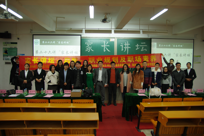 12月29日,由中山大学新华学院学生工作部主办、经济与贸易学院团委承办的第二十六讲家长讲坛——“启航之职场素养与职业规划”圆满举行。本次家长讲坛的主讲嘉宾是2014级金融工程专业潘家乐同学母亲、现任中国农业银行东莞分行党委组织部部长兼人力资源部总经理的陈爱嫦女士。