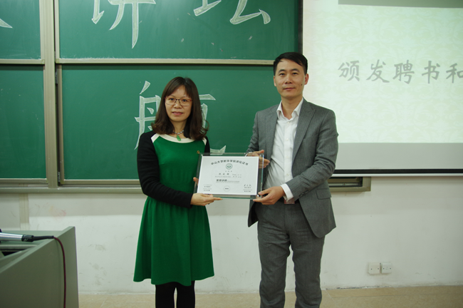 林秋贵校长助理为陈爱嫦女士颁发证书