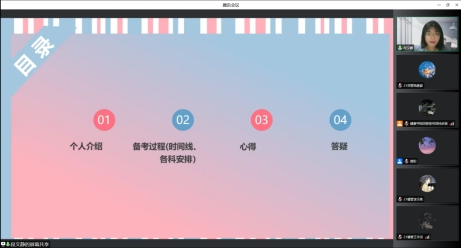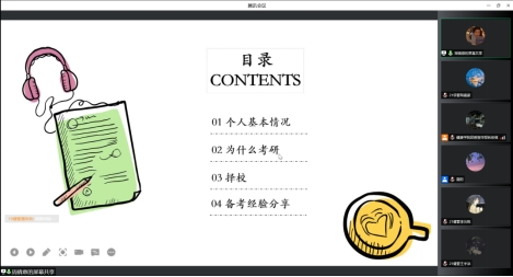 周倩意从个人基本情况、为什么考研、择校和备考经验分享这四个模块分别展示了她的考研经历。周倩意建议同学登录“中国研究生招生信息网”查看自己的心仪院校,根据自己平时的学习成绩制定自己的考研目标与方向。
