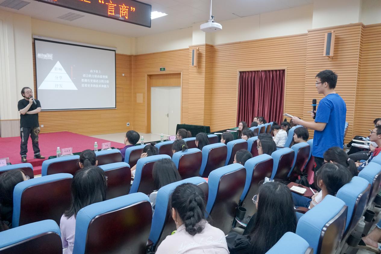 人为什么要说话?王超然认为有三种原因:交流、改变和发泄。王超然为在座师生讲述了“如何用一只羊换一百只狗”的故事,用大胆、夸张的例子说明即使双方供需不对等的情况下,语言也能填补缺失的价值。