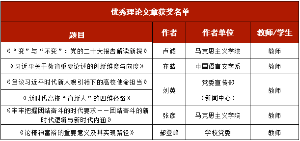 2022年10月-2023年3月,学校党委在全校师生中开展“学习宣传贯彻党的二十大精神”主题征文活动。近日,党委宣传部(新闻中心)本着公平公开公正的原则,组织评委专家评选出6篇优秀理论文章和3篇优秀学习心得,现将名单公布如下: