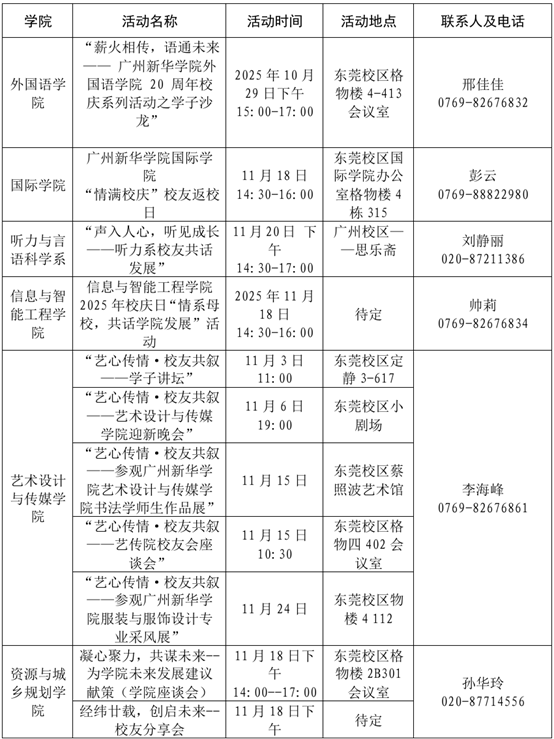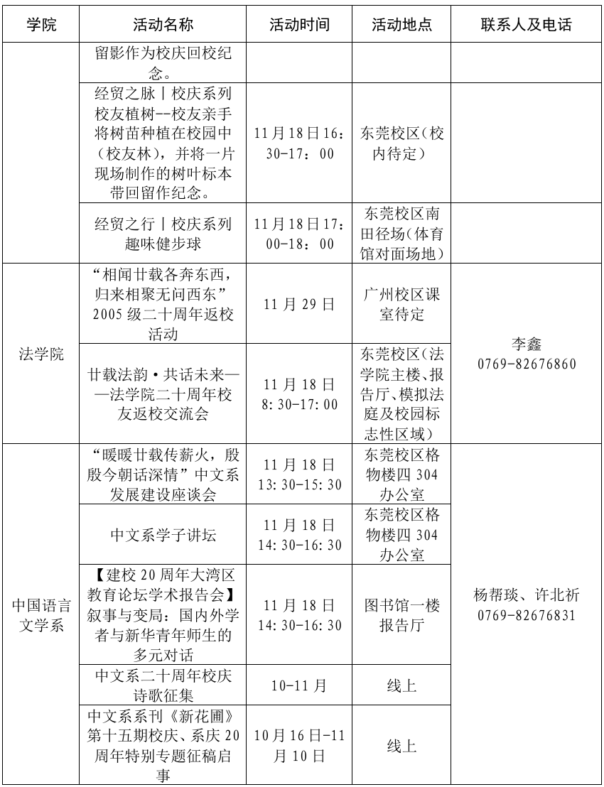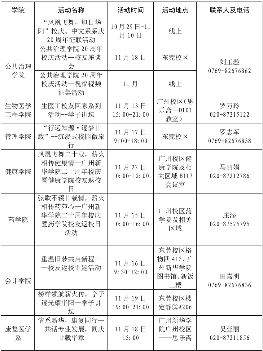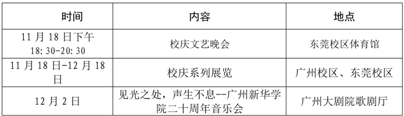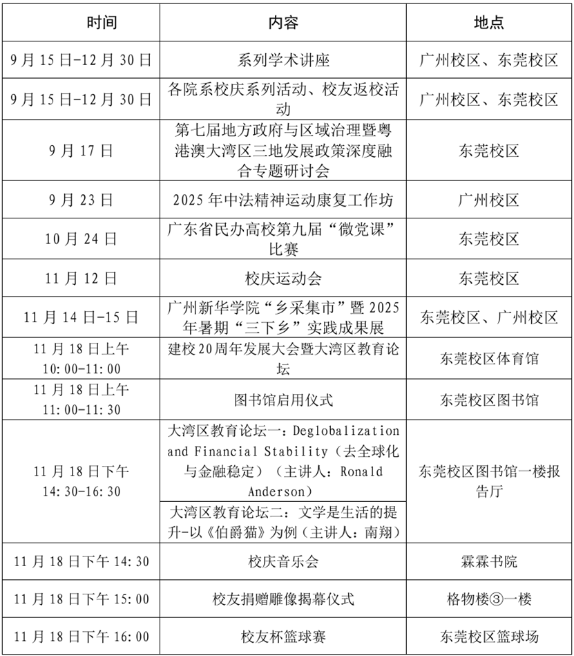 为迎接建校二十周年这一重要时刻,学校以“凤凰飞舞,旭日华阳”为主题,定于2025年11月18日在东莞校区隆重举行建校20周年发展大会暨大湾区教育论坛和新图书馆启用仪式,并于校庆日前后举办系列学生文化活动(具体安排详见附表)。我们诚挚邀请海内外校友、各界贤达拨冗莅临,相聚新华校园,共忆青春岁月,见证发展新篇,同绘未来宏图。