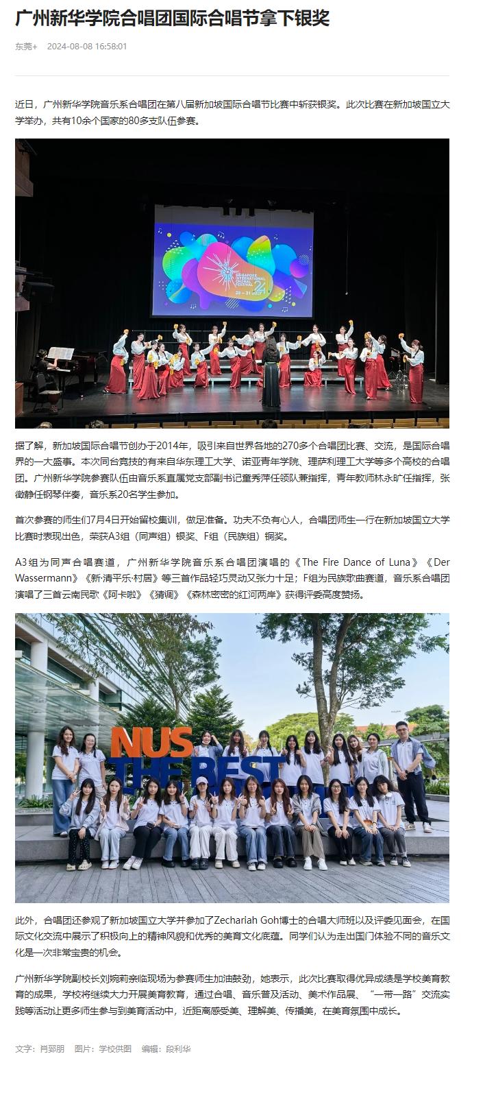 首次参赛的师生们7月4日开始留校集训,做足准备。功夫不负有心人,合唱团师生一行在新加坡国立大学比赛时表现出色,荣获A3组(同声组)银奖、F组(民族组)铜奖。