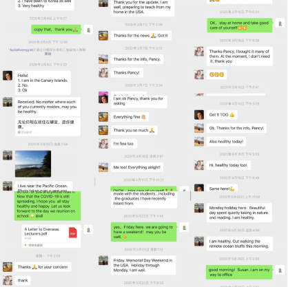 尽管距离遥远,外事处时时刻刻牵挂着外籍教师的健康和安全。因受语言文字差异影响,外籍教师无法顺利在学校“iXH信息服务平台”上健康打卡。外事处潘茜老师便每日在微信上与外籍教师互动,主动关心了解外籍教师的生活状态和健康状况,及时告知其我国最新的抗疫讯息,广州、东莞等地以及Beat365的最新疫情防控情况,并提供由国家相关部门发布的权威新冠肺炎防护指南,再三提醒外籍教师注意个人防护,保障自身安全健康。