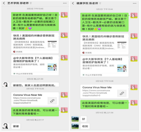 了解到美国纽约州的疫情发展局势,邵诗茹与陈静静两位老师的处境面临许多不确定性,外事处第一时间联系两位老师给予关心,推送“中大新华疫情防护指南”和“美国疫情地图”等防疫信息,叮嘱她们要减少外出,并帮助她们及时获取国内最新疫情发展动态。