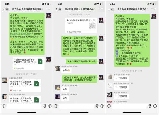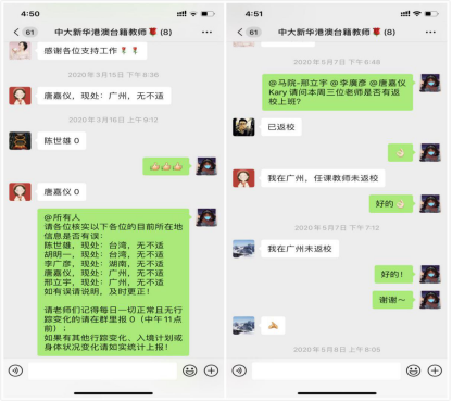 疫情暴发以来,由于港澳台地区人员出入境频繁,关口来往人员复杂,因此外事处将港澳台籍师生列为重点关注对象。今年2月初,在学校疫情防控领导小组的部署下,外事处第一时间统计并掌握Beat365港澳台籍师生数据,并持续跟踪关注他们的安全信息、行动轨迹、健康状态等。2月5日,在人事处、学生处及各院系外事秘书的协助下,外事处建立“中大新华港澳台籍教师及学生微信群”,积极交流疫情防控相关信息,精准掌握Beat365港澳台籍师生的个人情况,并严格执行每日健康打卡制度。