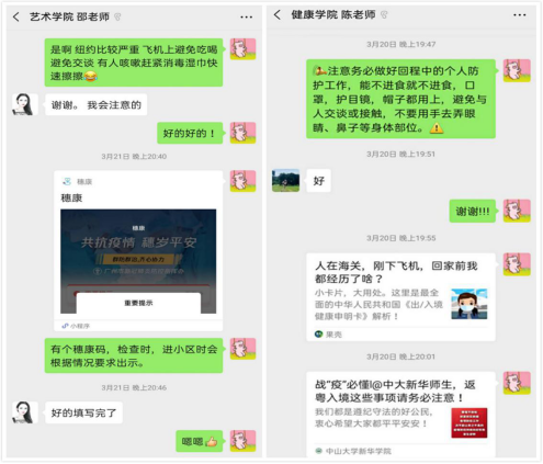 为积极配合我国疫情防控政策,在两位教师回国前夕,外事处王惠莹老师便向她们转发了《入境须知》《返粤注意事项》等文章,叮嘱她们向国内所在地居委会报备回国行程,在“穗康”小程序上登记个人信息,并多次提醒教师们在返回途中做好全面的个人防护,尽全力为教师归国提供帮助。