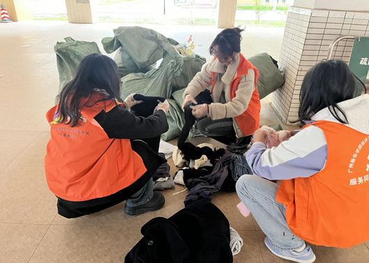 活动过程中,党员同志们与志愿者们身着统一的橙色马甲,深入宿舍回收衣物。满载爱心的回收袋在小推车的运送下,被有序地运至集合点进行分类、整理与计数。在运输途中,他们团结协作,洋溢着收获的喜悦,他们欢声笑语、秩序井然,共同为衣物搬运贡献力量。