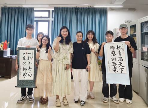 为深化教师节系列活动内涵,除了与老师合影外,中国语言文学系的同学们还准备感恩教师节的心意礼物,余涛同学亲笔书写“师恩似海深,桃李满天下”,通过传统书法艺术载体传递学子赤诚之心,彰显新时代尊师重教新风尚。