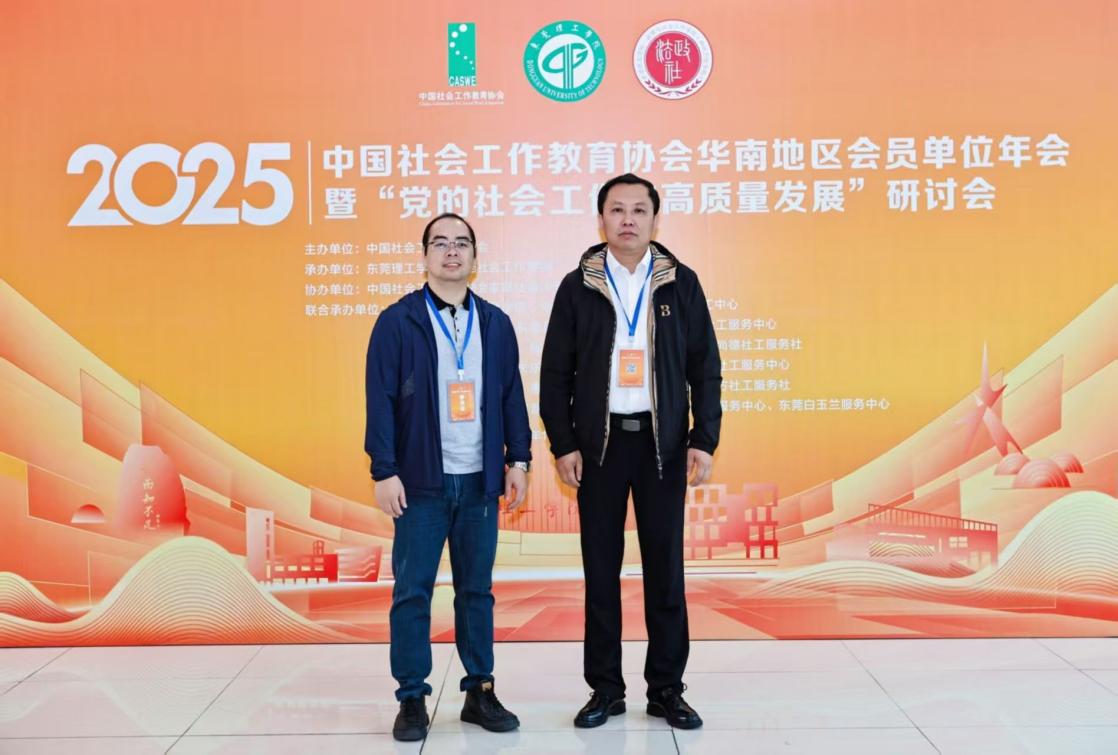10月25日,中国社会工作教育协会2025年华南地区年会暨“党的社会工作与高质量发展”研讨会在东莞理工学院举行。Beat365中国唯一官方网站公共治理学院党总支书记王光辉副教授、教工党支部委员黄远清博士应邀参会。