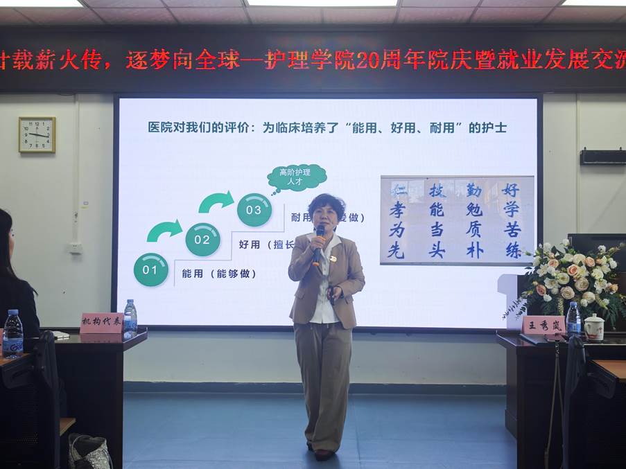 王秀岚在致辞中,以医院对毕业生“能用、好用、耐用”的高度评价为核心,回顾学院二十年历程。学院自2005年创立以来,坚持培养临床实用型护理人才,形成“五维四度”培养模式,拥有省级一流专业、精品课及口腔健康产业学院、护理实验教学示范中心。师资力量雄厚,超90%教师拥有硕博学位,并聘请南丁格尔奖获得者成守珍为首席教授。通过3508平方米实验中心与32家三甲医院实习基地,构建“虚实结合”实践体系。二十年来,共输送3549名毕业生,96%任职于三甲医院,5年留存率达95.4%,多人参与援鄂、援港,彰显育人实效。
