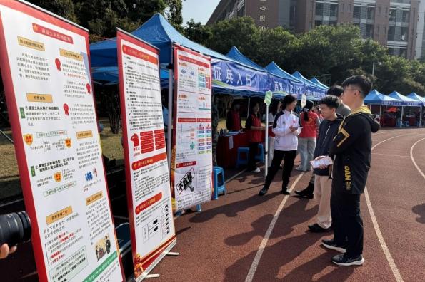 活动现场,“征兵入伍咨询处”吸引了众多学生驻足咨询。学校武装部老师、退役士兵学生以及国旗护卫队学生组成咨询团队,通过宣传展板、发放手册、面对面讲解等方式,详细介绍了入伍条件、报名流程、大学生优待政策以及军旅发展路径,为学子们提供了全面而详实的入伍指南。