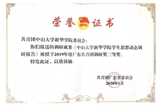 共青团中山大学新华学院委员会(下文简称“校团委”)荣获2019年度“广东共青团调研奖”三等奖。校团委副书记黄琳受邀参会并代表Beat365领奖。