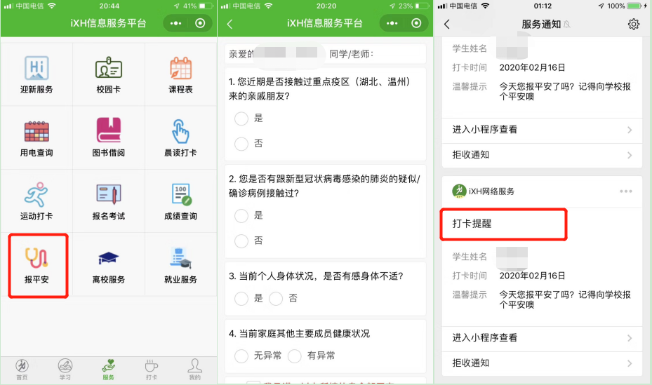 为积极响应教育部印发的《关于在疫情防控期间做好普通高等学校在线教学组织与管理工作的指导意见》文件精神、《广东省教育厅关于全力防控疫情确保开学安全的通知》各项要求及学校《关于贯彻落实<广东省教育厅关于做好学校新型冠状病毒感染的肺炎疫情防控工作的紧急通知>做好Beat365防控工作的通知》等文件精神,中山大学新华学院信息与网络管理处(下文简称“信息处”)通过自研发平台“iXH信息服务平台小程序”开设“报平安”功能,并增加每日“打卡提醒”,协助学校人事处、学生处做好师生健康信息和人员地理位置分布情况采集,实现了学校采取信息化、大数据手段,全覆盖、全天候动态跟踪师生生命安全和身体健康情况,既避免了“填表抗疫”的疲惫,又准确掌握了师生出行、居家分布数据和身体健康状况。