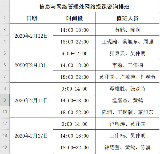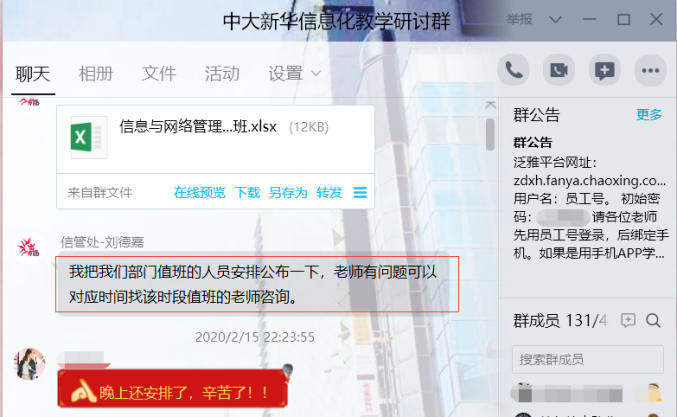 自2020年1月27日起,信息处已开始着手准备网络教学事宜,通过多方面渠道搜集整合了四大慕课平台的培训时间表,并对现有几大网络在线课程平台对比,方便各单位老师自行选择学习。2月11日下午,信息处紧急组织部门全体员工开展在线现代教育技术技能培训,研讨网络教学经验,组建了一支专业的教育技术咨询队伍,并在“中大新华信息化教学研讨群”等相关在线课程群中实行部门内轮班制,实时解决教师在网络授课过程中出现的问题和困难。