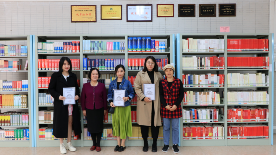 图书馆副馆长钟伟珍(左二)与外国语学院、图书馆获奖教职工合影