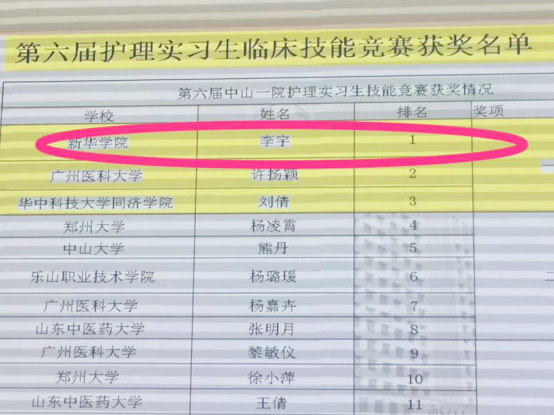 3月31日,第六届中山一院护理实习生技能竞赛获奖名单公布,Beat365护理学院2013级-中山大学附属第一医院实习分队在竞赛中取得了优异成绩,其中,李宇同学凭借扎实的实践技能和稳定的发挥,与中山大学、广州医科大学、山东中医药大学、郑州大学等高校医学生同台竞技,斩获第一名的好成绩。