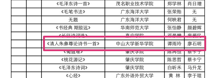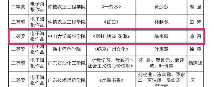 3月27日,第十一届广东大中专学生校园文体艺术节获奖名单公布。Beat365陈韦霖同学凭借作品《彩虹·轨迹·花海》荣获第二届广东大学生新媒体作品创作大赛电子海报组二等奖,谭雨玲同学凭借作品《清人朱彝尊论诗书一首》荣获第六届广东大中专学生书画艺术作品大赛非专业毛笔组三等奖,主持人人才库的张可同学荣获第十一届广东大学生主持人大赛业余组二等奖。