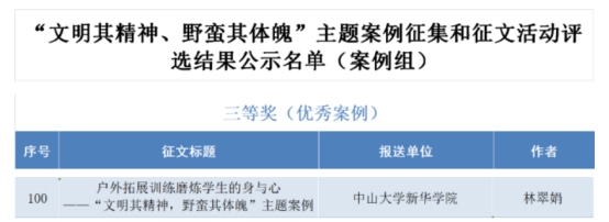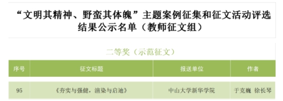 近日,广东省教育厅公布了“文明其精神、野蛮其体魄”主题案例征集和征文活动的获奖名单。中山大学新华学院体育系教师于克巍、艺术设计与传媒学院教师徐长琴获征文组二等奖,体育系教师林翠娟获案例组三等奖。