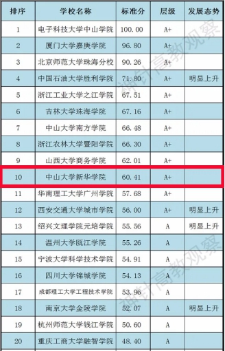 2020年的评价对象包括170所民办本科院校(比上一年增加9所)和238 所独立学院(比上一年减少16所)。进入2020中国民办本科院校科研竞争力评价结果C+级及以上的高等院校共有85所,中山大学新华学院位列全国独立学院第10位,结果排序(节选)如下: