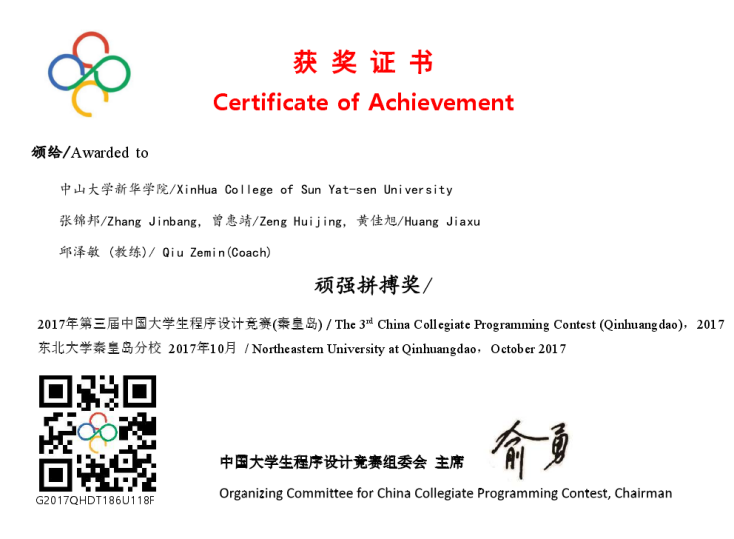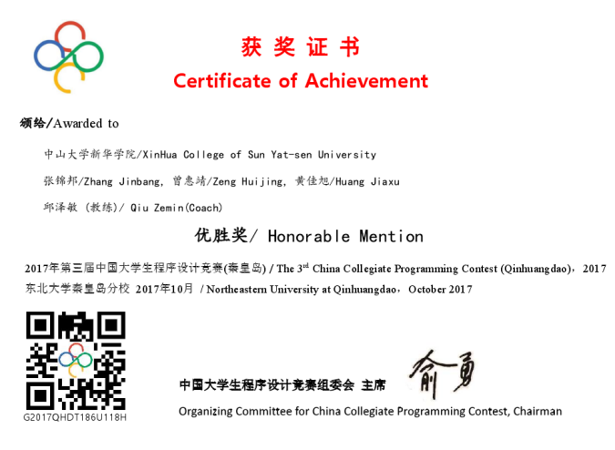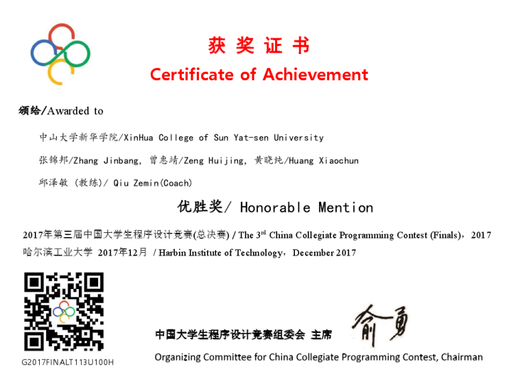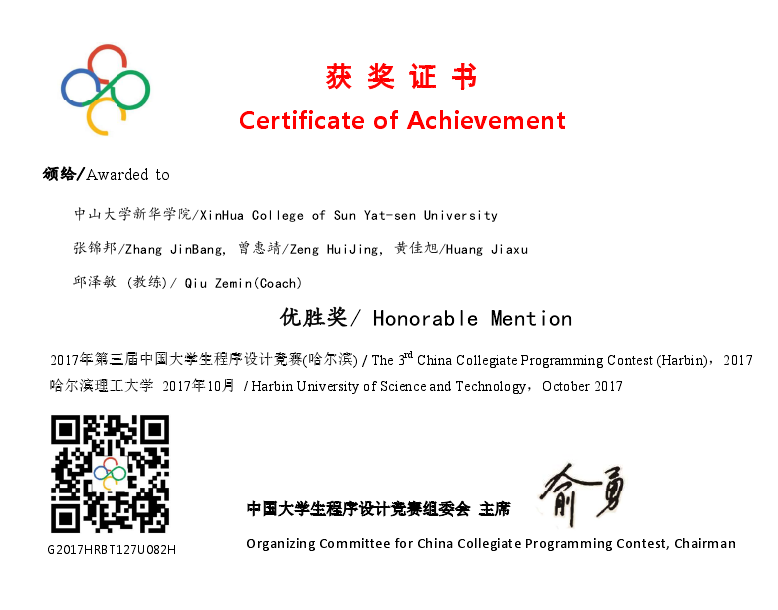 2017年第三届中国大学生程序设计竞赛(英文名称为China Collegiate Programming Contest,简称CCPC)已于12月3日落下帷幕,信科院张锦邦、黄佳旭、曾惠婧、黄晓纯组成的竞赛团队参赛。该项比赛遵循国际大学生程序设计竞赛(ACM-ICPC)赛制,分为网络赛、国赛和总决赛三个流程,全国各大高校都组成本校最强程序设计队伍参赛。