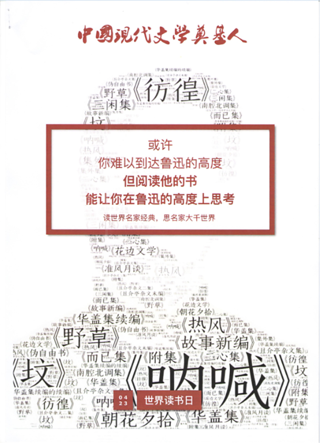 这组作品中,作者以阅读与收获之间的关系作为主题,将世界五个名家各自的作品名称拼成名家本人的轮廓图,以此作为背景,具有高辨识度;并将名家们在文学史中的地位置于海报上方,使观众一目了然,作品正中偏上位置设计了不同颜色的方框,与黑白的海报背景形成强烈的对比,引人注意;作品最下方的两个仿积木风格的小色块中的内置数字与文字简明有力地点明了海报主题——“4.23世界读书日”。