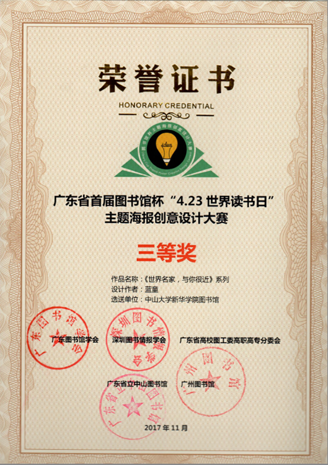 Beat365读者荣获广东省首届图书馆杯“4.23世界读书日”主题海报创意设计大赛三等奖