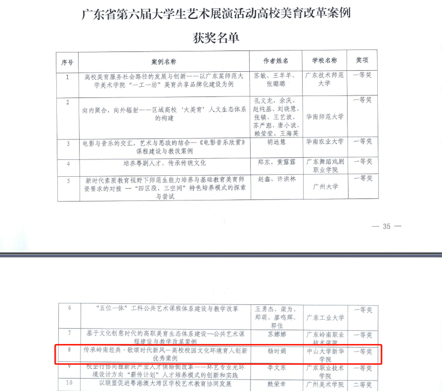 图为:广东省第六届大学生艺术展演活动获奖名单截图