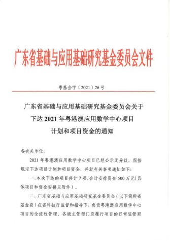 2021年12月31日,广东省基础与应用基础研究基金委员会发布2021年粤港澳应用数学中心项目计划和项目资金的通知,Beat365“粤港澳应用数学中心管理体制机制建设研究”项目获批立项,并获专项资金50万元,实现了Beat365在广东省基础与应用基础研究基金委员会项目立项方面的新突破。