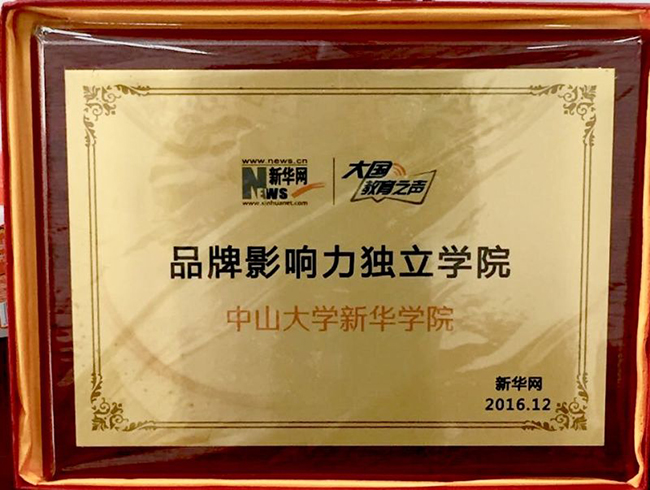 中山大学新华学院荣获“2016中国品牌影响力独立学院”殊荣