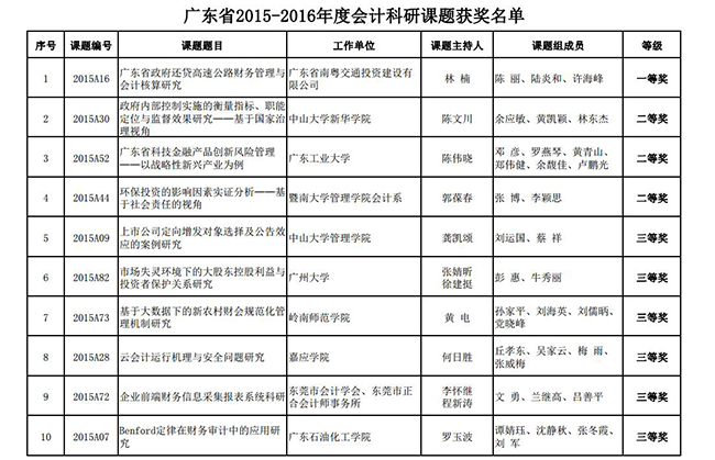 11月8日,广东省财政厅发布“关于广东省2015-2016年度会计科研课题评审结果的通报”,经过专家评审委员会评审,获准结题的会计课题共74项,其中获一等奖1项,二等奖3项,三等奖6项。