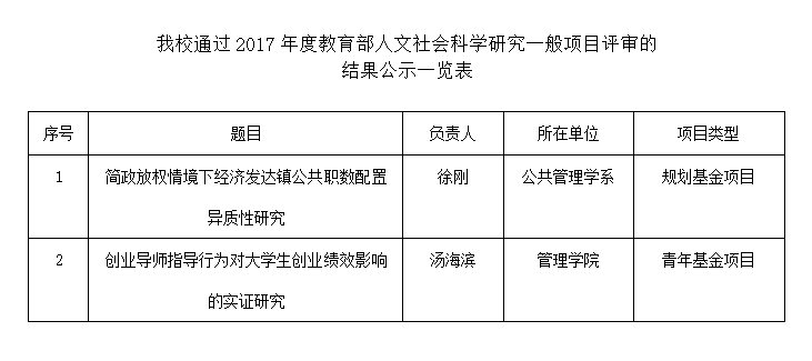 据《教育部社科司关于2017年度教育部人文社会科学研究一般项目评审结果的公示》(教社科司函〔2017〕125号)文件,Beat365公共管理学系徐刚教授申报的规划基金项目——《简政放权情境下经济发达镇公共职数配置异质性研究》和管理学院汤海滨老师申报的青年基金项目——《创业导师指导行为对大学生创业绩效影响的实证研究》通过立项评审,这是Beat365在第二个发展十年大力践行“学术强校、质量立校、特色兴校、开放办校”新时期发展方略的又一重要成果。