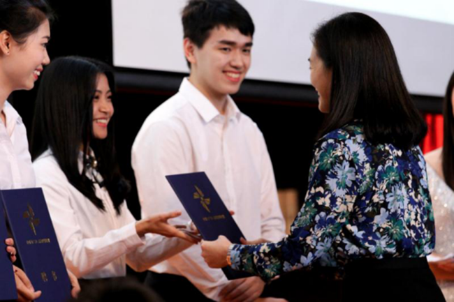 中国(广东)高校传媒联盟秘书长林洁老师(右一)为新主席团颁发聘书