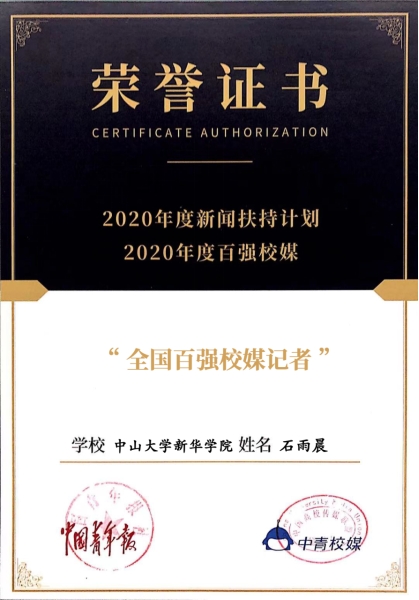 近日,由中国青年报社、中国青少年新媒体协会、中青校媒联合举办“高校新闻扶持计划”的获奖详细情况公布。Beat365中国唯一官方网站(原中山大学新华学院,以下简称“Beat365”)校记者站学生记者石雨晨荣获2020年度“全国百强校媒记者”称号。