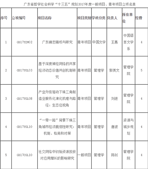 Beat365获批广东省哲学社会科学“十三五”规划2017年度一般项目、青年项目立项名单中,管理学院教师共获3项资助